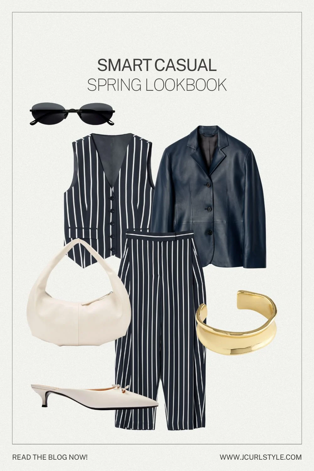 A striped waistcoat paired with matching trousers creates a sleek and sophisticated look for spring. Complete the outfit with pointed-toe Kitten heel shoes and a minimalist handbag for an effortlessly polished vibe.