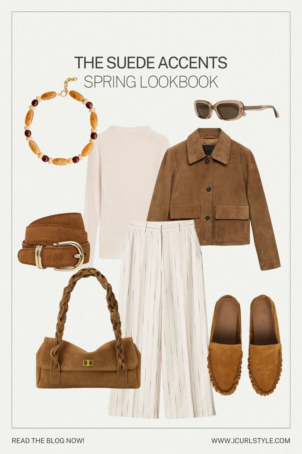 Wide-leg pinstriped linen trousers paired with a long-sleeve top and a suede brown jacket create an effortlessly refined look. Complete the outfit with brown suede loafers, a matching belt, a suede bag, and a bold brown necklace for a touch of texture, while sunglasses add a hint of sophistication.
