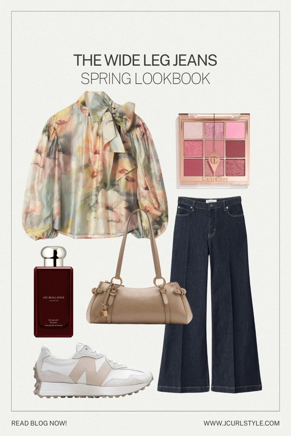 Wide-leg jeans paired with a voluminous flower print blouse create a chic look for spring. Finish this outfit with sneakers for comfort and a small bag in the same color as the sneakers for a effortless elegant spring outfit idea.