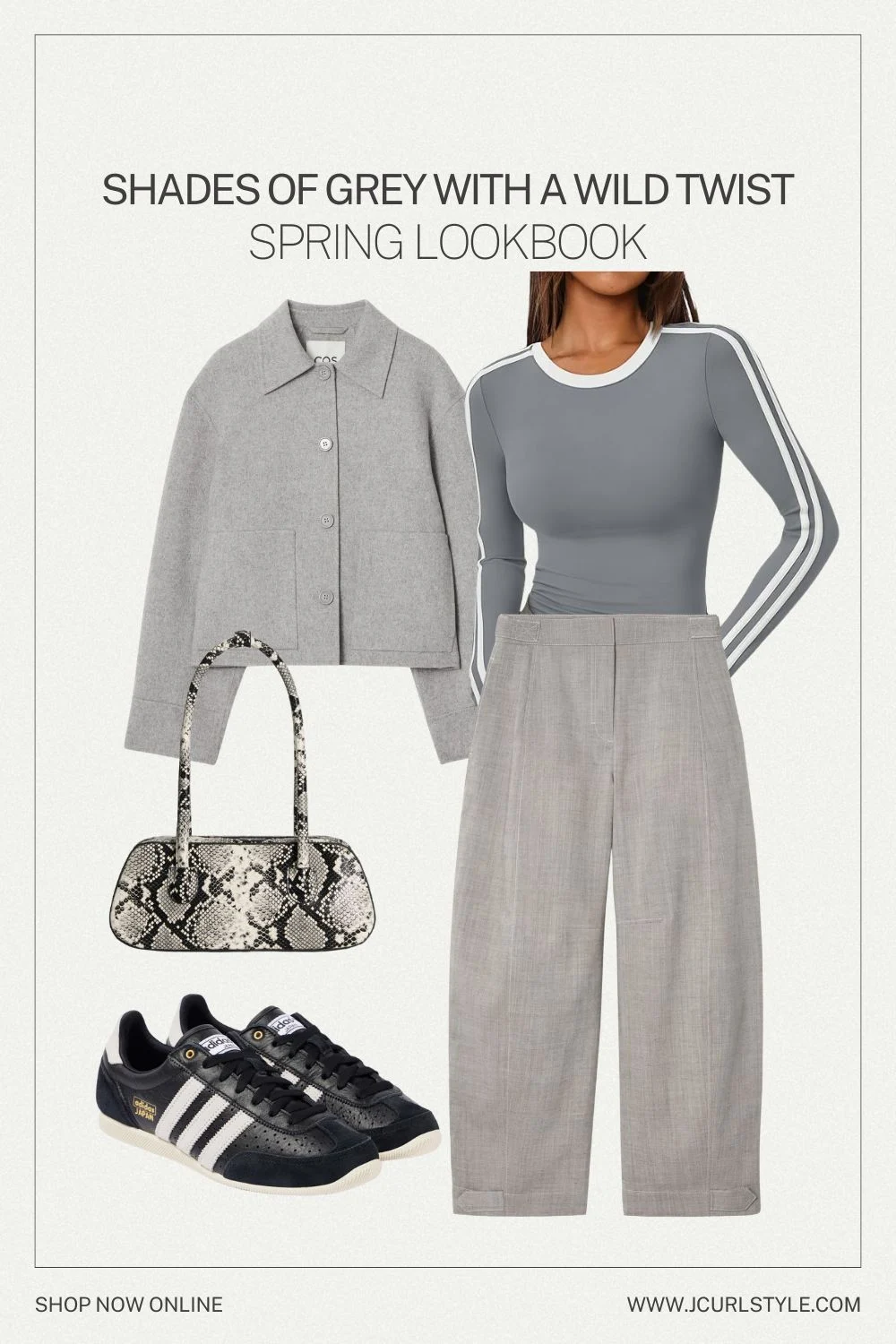 A sleek and modern look with grey trousers paired with a matching long-sleeve top for a monochrome vibe. Add a grey short jacket for a touch of structure, while black and white Adidas sneakers keep the outfit effortlessly cool. To break the neutral palette, an animal print bag adds a bold twist, bringing personality to this polished look.