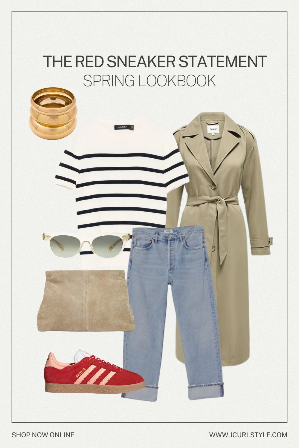 Make a bold statement this spring with red sneakers as the focal point of your outfit. Pair them with light denim jeans and a striped knitwear top for a fresh and casual vibe. A trench coat adds a touch of sophistication, while a suede clutch bag keeps things refined. Finish the look with a set of gold bracelets and sunglasses.